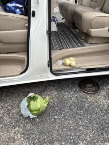 渋滞無しで桶川まで帰ってきて、加藤さんちで荷物降ろすー「先にメッシュバック玄関まで運んでくるから!野菜は後から取りに行くから!」と行かれましたが。。