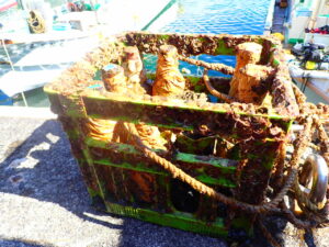 引き上げ直後は酒ケースにフジツボが着き始め、瓶は全部クッション材に巻いてあるからそれを剥がすとー