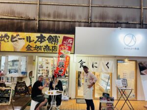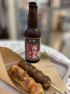 タップから生ビール注いでもらい、隣の肉屋で石垣牛とアグーの団子頼んで焼いてもらって