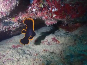 なんでも明日以降の野原曽根やヨナラ水道はドリフトになりますと。そんな流れのある海の中でさっきみたいに幅ひろーーーく、のーーーんびり潜ってると見せたい魚がいてもすぐに案内できないのがガイドして申し訳ないので、次回はギュっと固まって泳ぎましょ!なんかあったらすぐ手の届くところにいてください!と。。