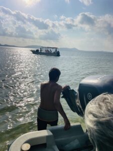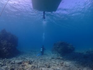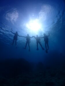 とにかく天気いいから太陽光が気持ち良すぎる。体験ダイバーの呼吸練習を横目に我々は各自水底集合。