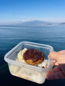 はい、今日のお昼は富士山見ながらのハンバーグ丼^ ^