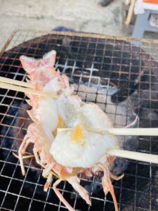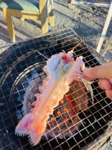 この大きな手長海老を豪快に真っ二つにしてボンと炭の上に!