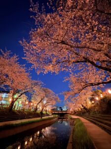 夜に戻り、荒川の満開の桜を天才的に撮り